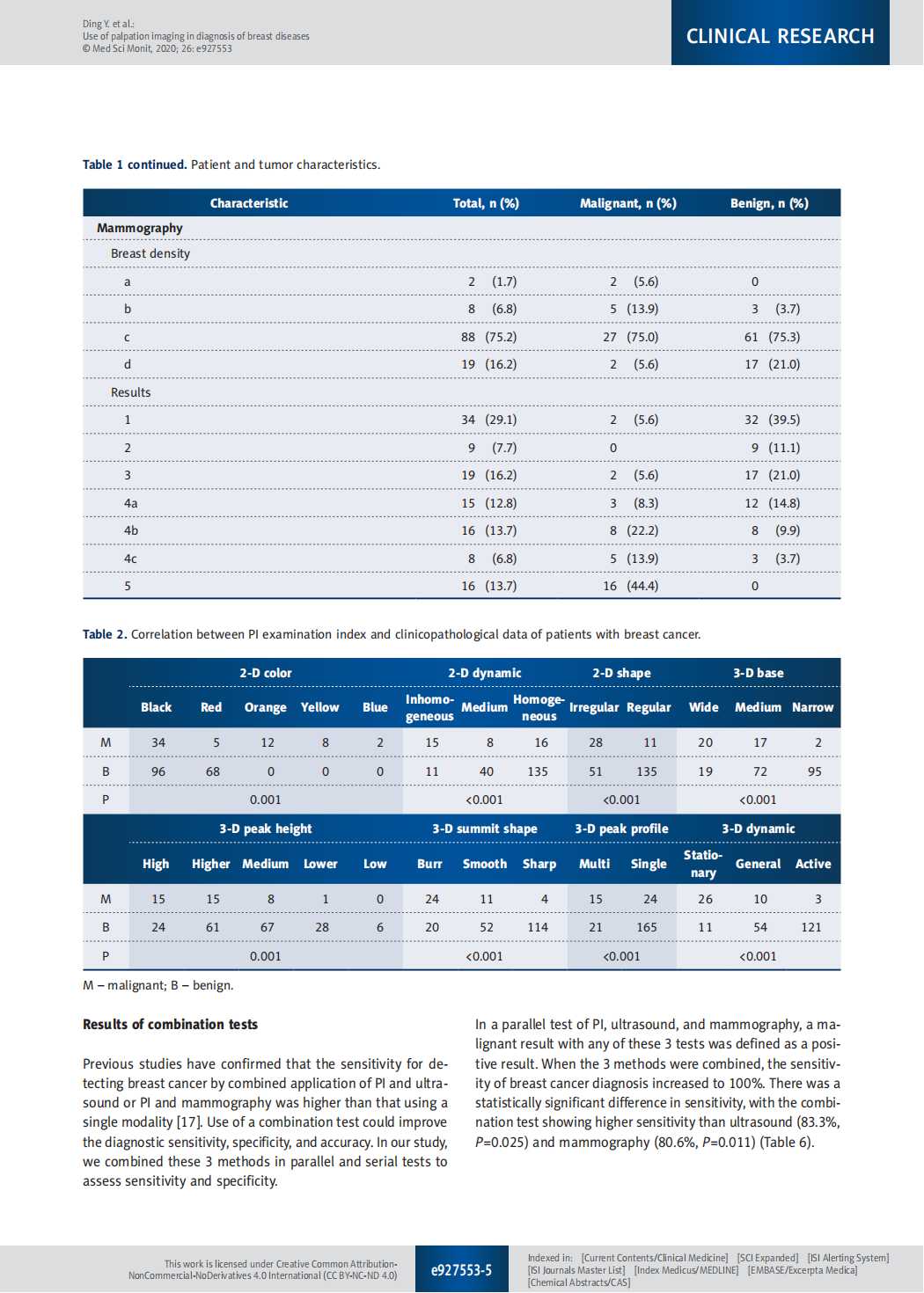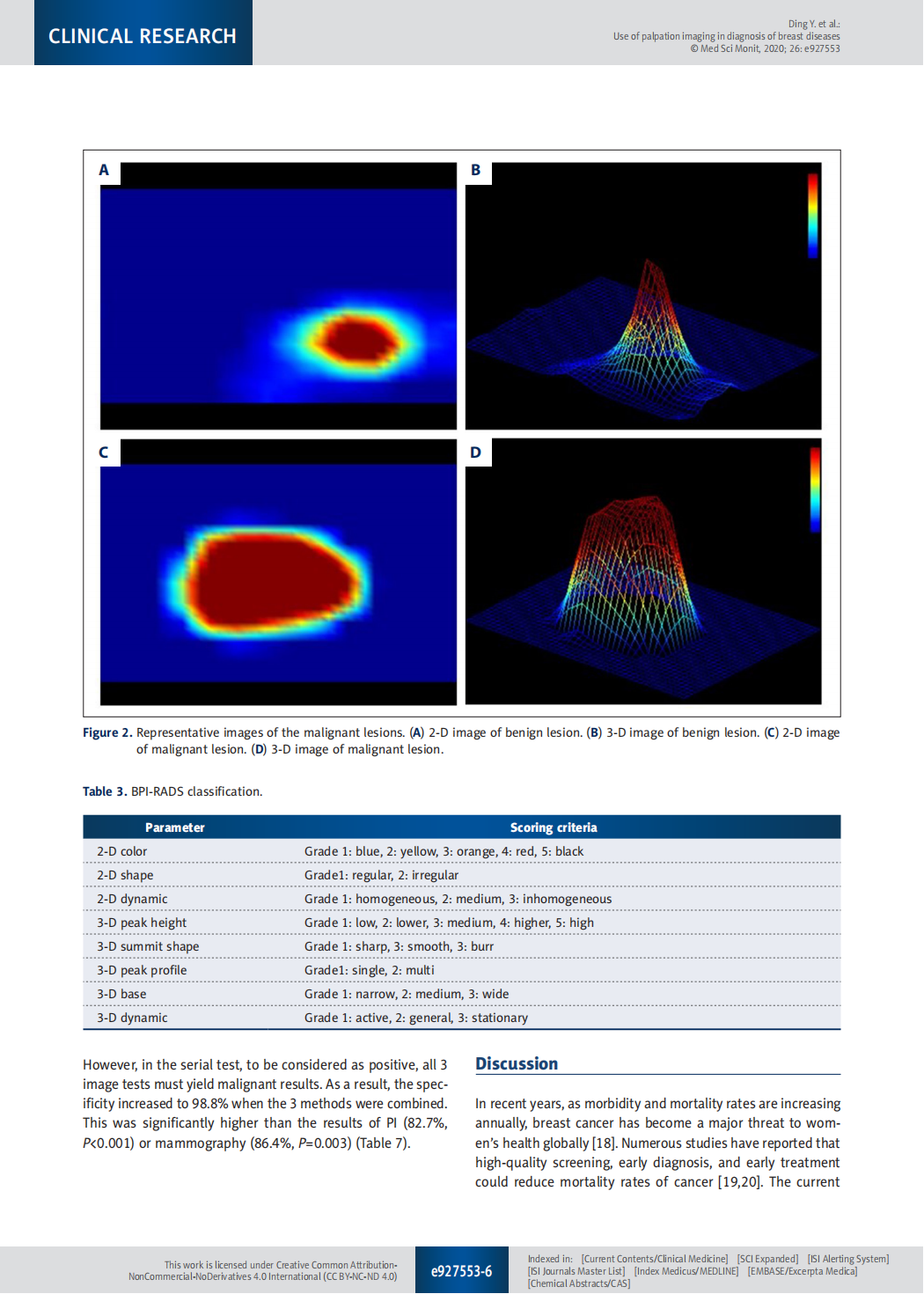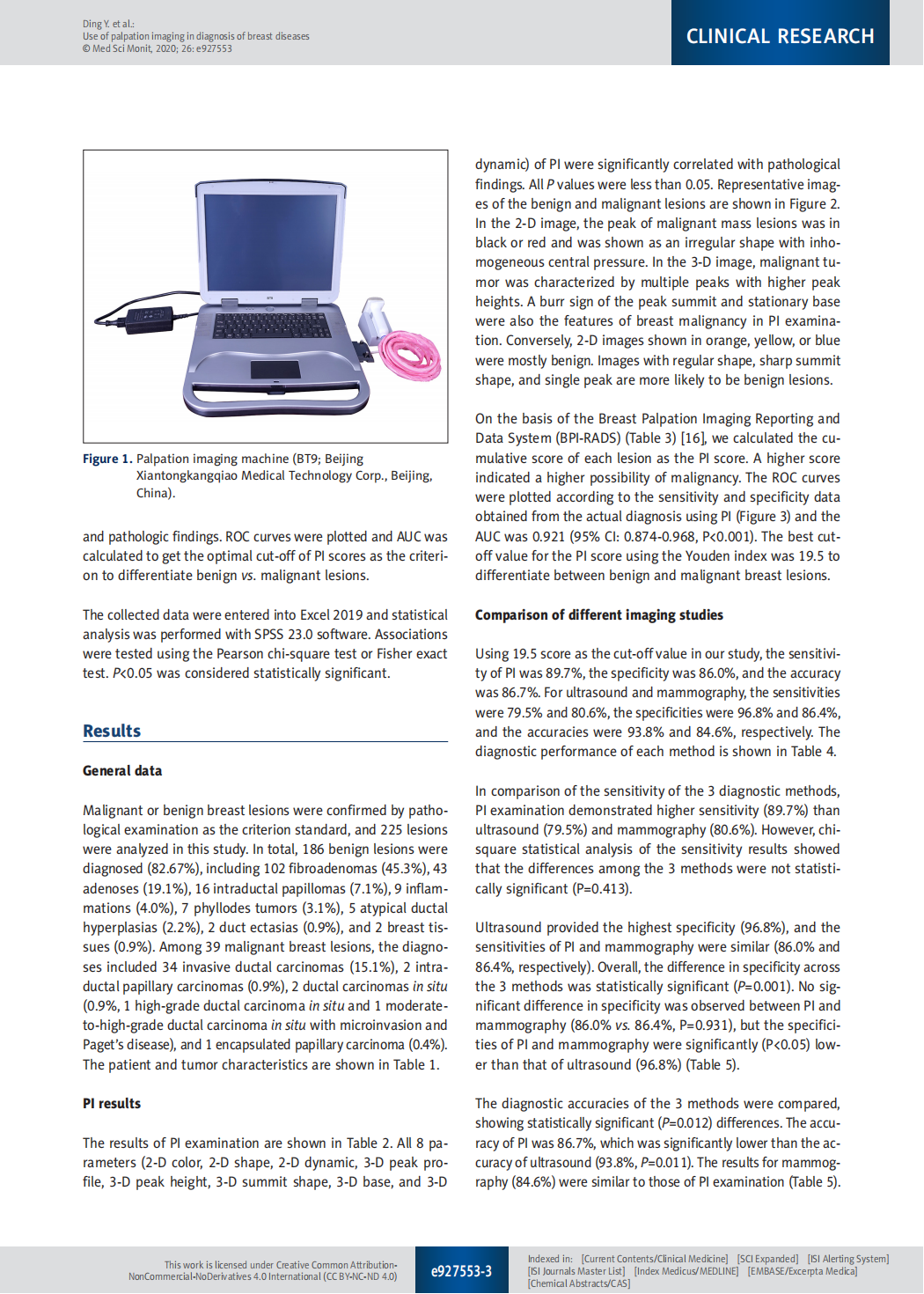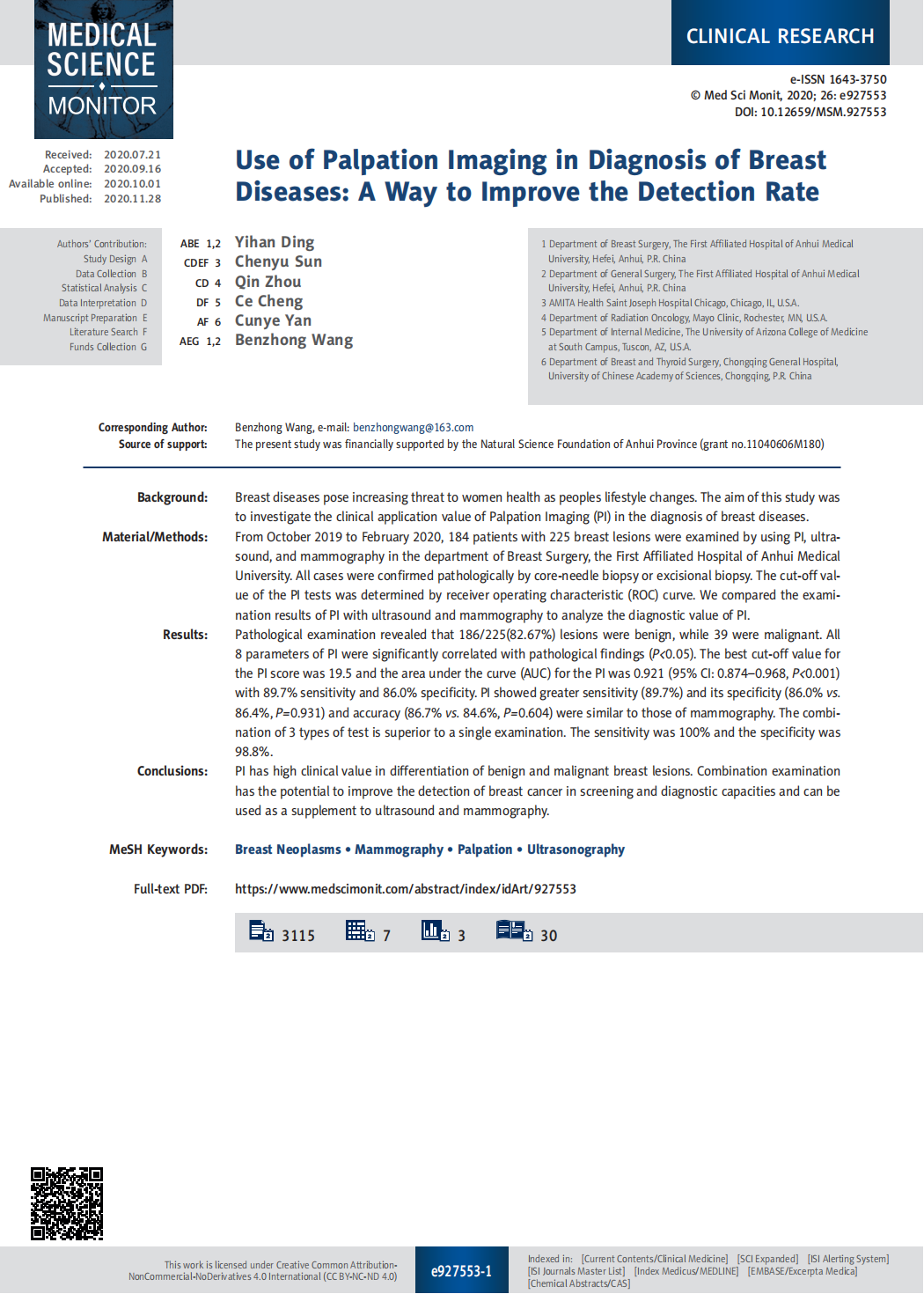 2020年,安徽医科大学附属第一医院乳腺外科王本忠教授团队,在 Medical Science Monitor杂志发表了仿生触诊成像的临床应用研究。